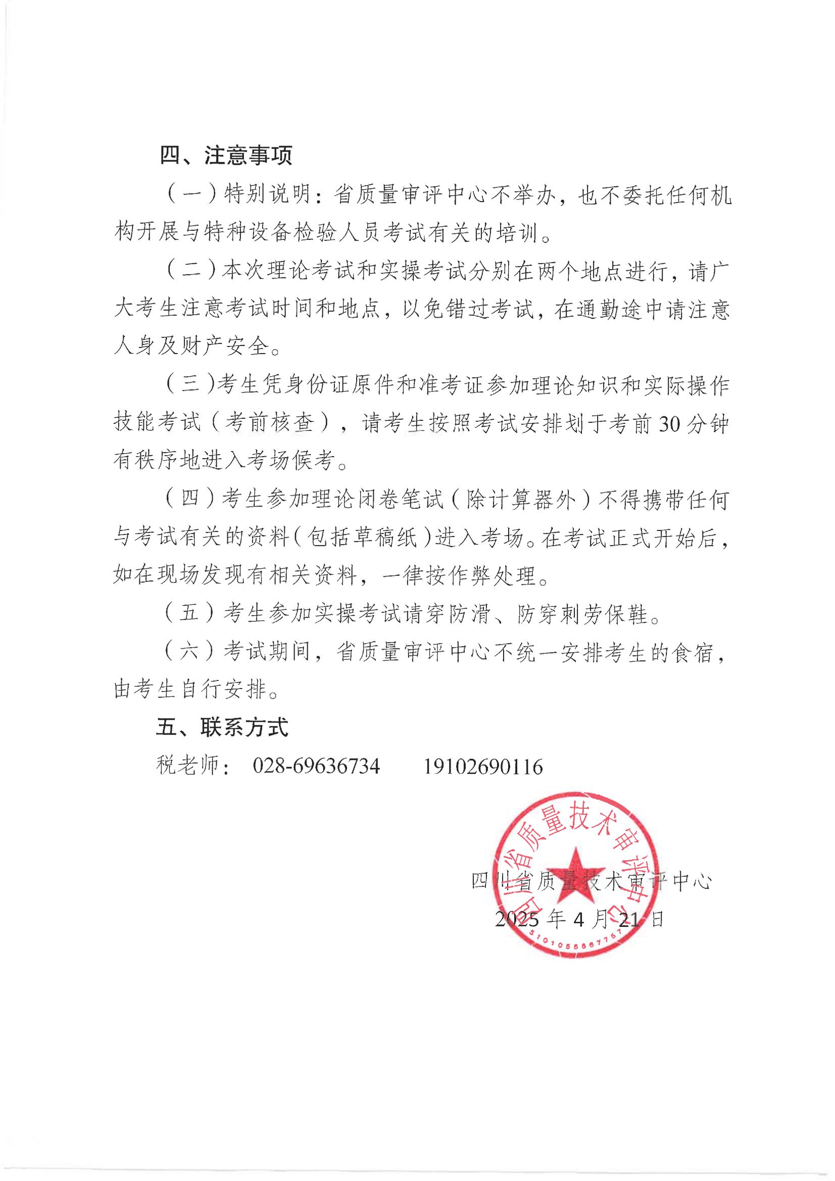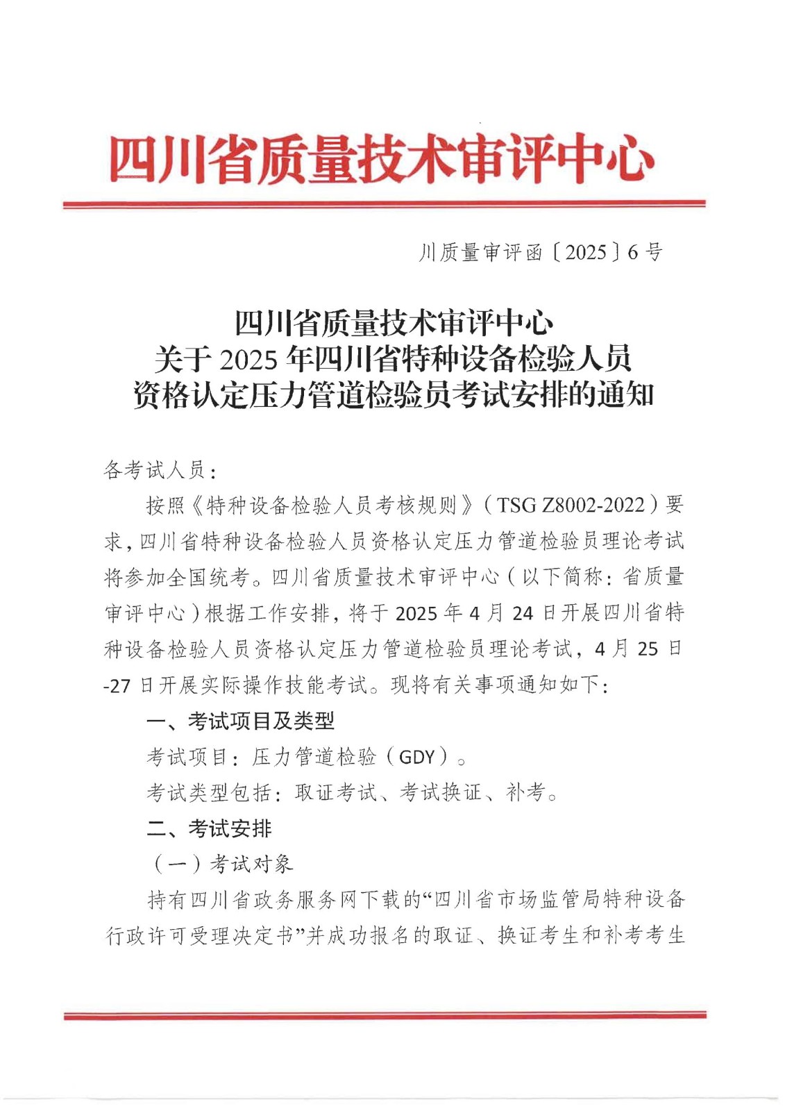 四川省質(zhì)量技術(shù)審評中心關(guān)于2025年四川省特種設(shè)備檢驗人員資格認定壓力管道檢驗員考試安排的通知