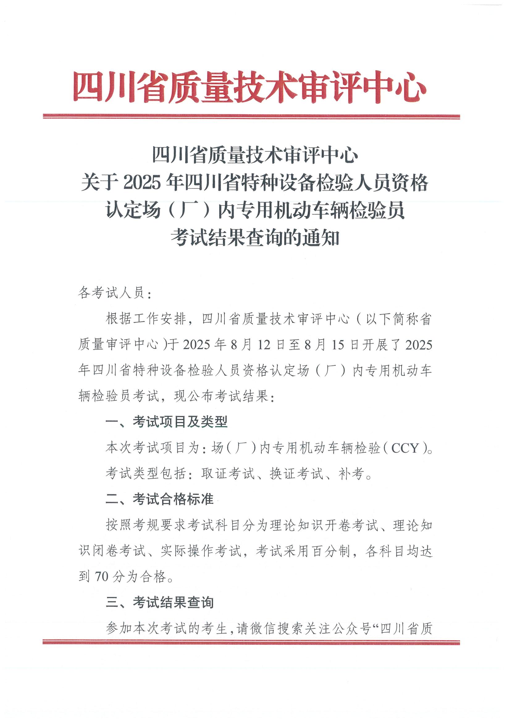 四川省質(zhì)量技術(shù)審評中心關(guān)于2025年四川省特種設(shè)備檢驗人員資格認(rèn)定場(廠)內(nèi)專用機(jī)動車輛檢驗員考試結(jié)果查詢的通知