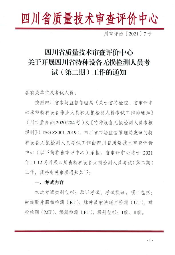 川審評函(2021)7號:關(guān)于開展四川省特種設(shè)備無損檢測人員考試(第二期)工作的通知