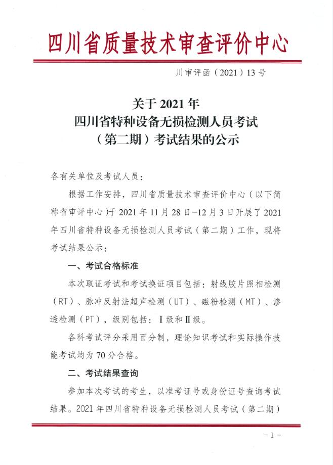 關(guān)于2021年四川省特種設(shè)備無損檢測人員考試(第二期)考試結(jié)果的公示