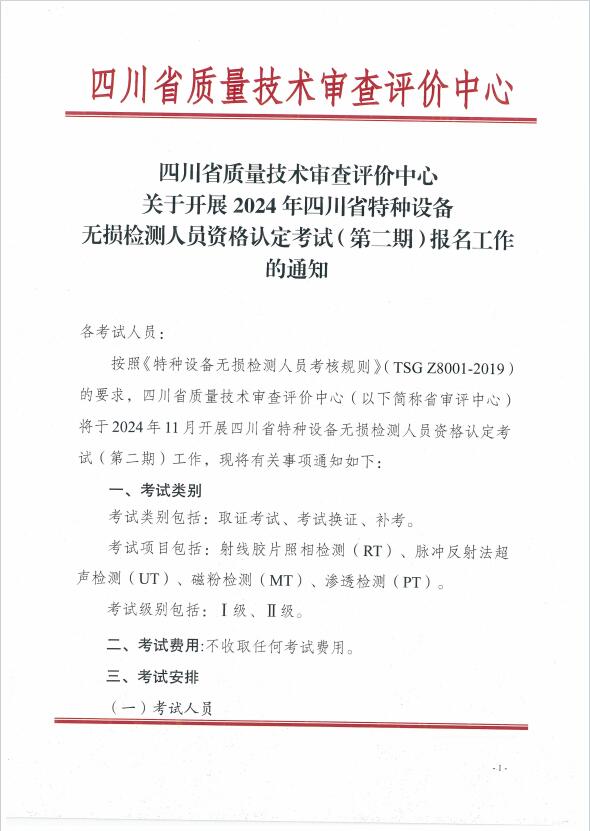 關(guān)于開展2024年四川省特種設(shè)備無損檢測人員資格認(rèn)定考試(第二期)報名工作的通知