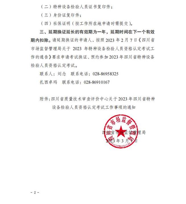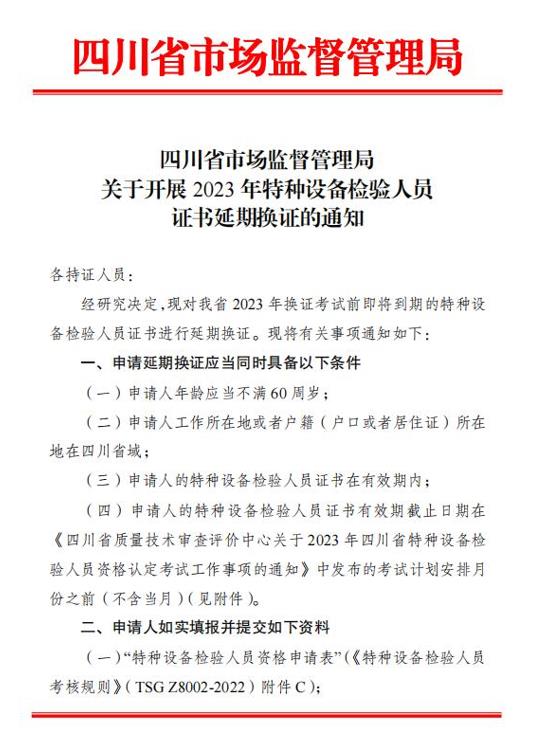 四川省市場(chǎng)監(jiān)督管理局關(guān)于開(kāi)展2023年特種設(shè)備檢驗(yàn)人員證書(shū)延期換證的通知