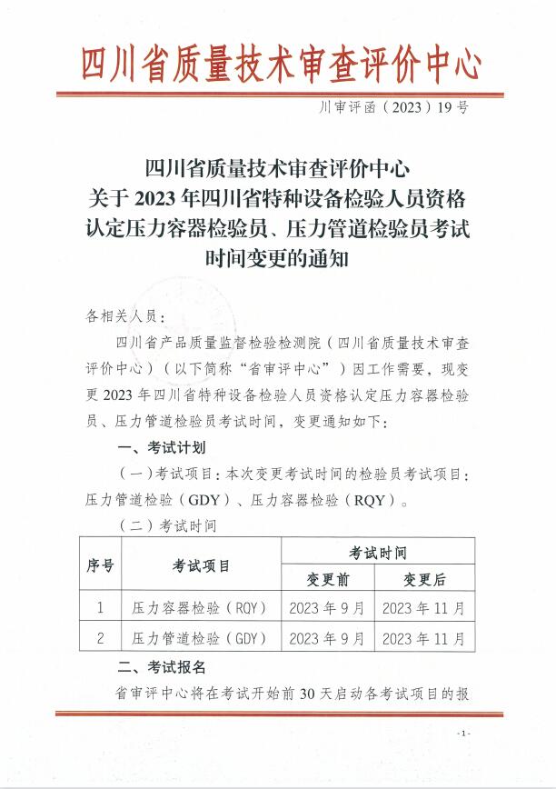 川審評函(2023)19號:審評中心關(guān)于特種設(shè)備壓力容器、壓力管道檢驗員考試計劃變更的通知