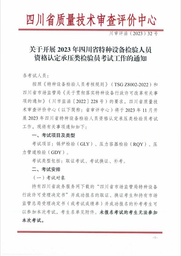 關(guān)于開展2023年四川省特種設(shè)備檢驗人員資格認(rèn)定承壓類檢驗員考試工作的通知