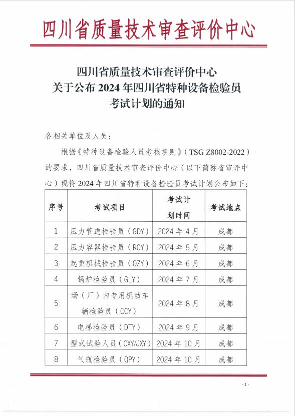 附件:關(guān)于公布2024年四川省特種設(shè)備檢驗(yàn)員考試計(jì)劃的通知