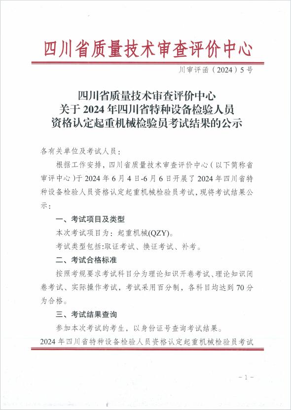 關(guān)于2024年四川省特種設(shè)備檢驗(yàn)人員資格認(rèn)定起重機(jī)檢驗(yàn)員考試結(jié)果的公示