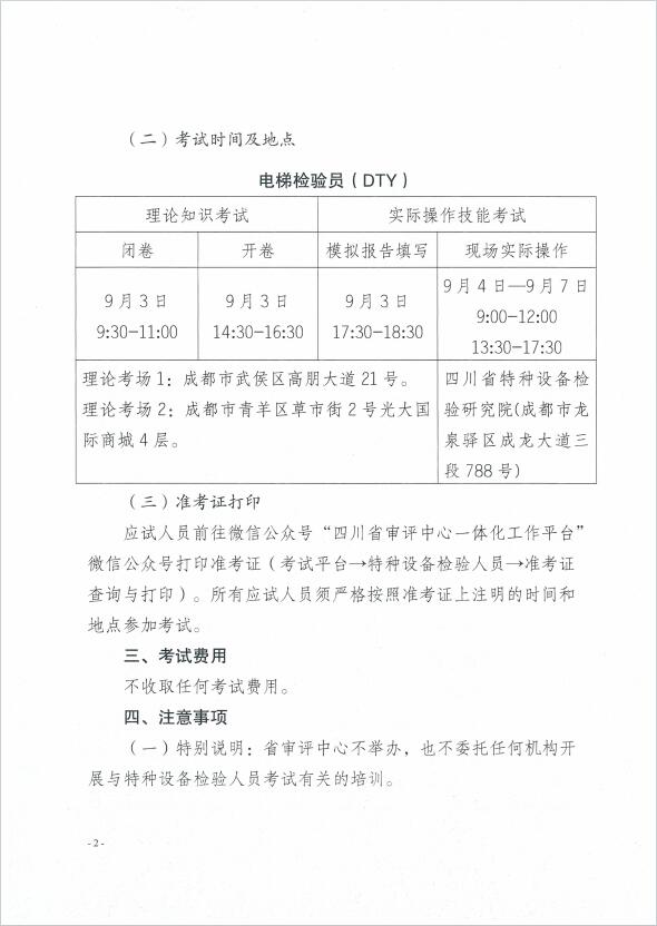 關(guān)于2024年四川省特種設(shè)備檢驗(yàn)人員資格認(rèn)定電梯檢驗(yàn)員考試安排的通知